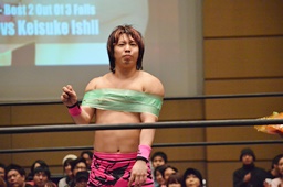 挑戦者・石井が両腕縛られた状態で入場、ガッツポーズも小さめ(右写真)。
