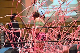 ここでHARASHIMAの両腕を縛るテープが切れたため試合中断、補強に(右写真)。