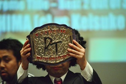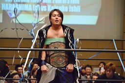 王者・HARASHIMAも縛られた上からガウン着て入場(右写真)。コールの後KUDOに脱がせてもらう。