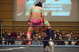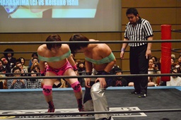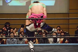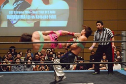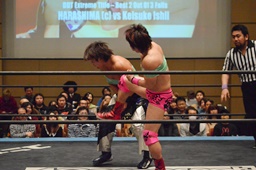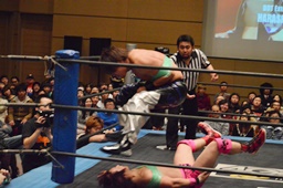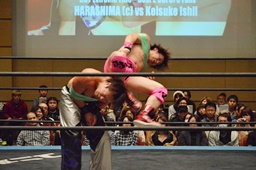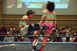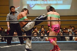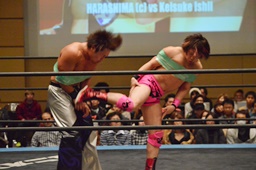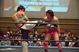 ロープに飛ぶ、石井ドロップダウン、HARASHIMA飛び越す(左写真)。