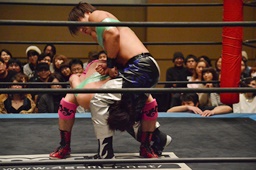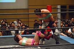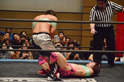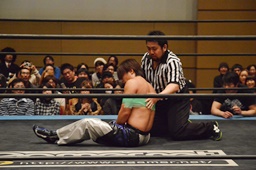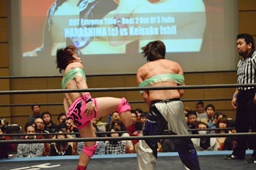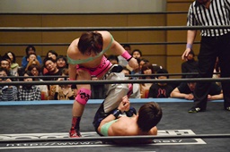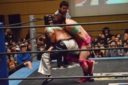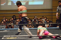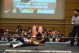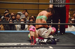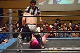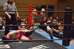 HARASHIMAサッカーボールキック、ヒザで押さえつけてカバー(右写真)、カウント2。