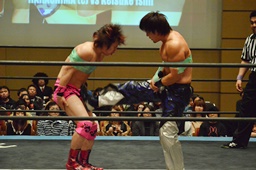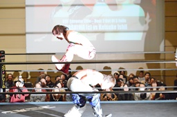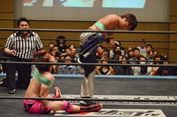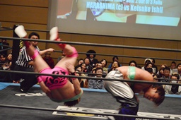 ダウンしたHARASHIMAにサマーソルトドロップ、HARASHIMAかわす(左写真)。