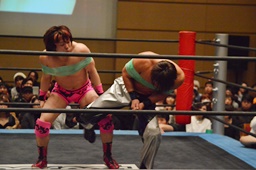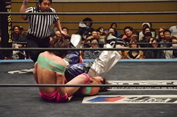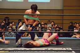 足だけの卍固めに(右写真)、さらに足だけで河津落とし、カウント2。