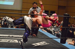 振り返ったHARASHIMAに断崖式フランケンシュタイナー(左写真)、石井勝利。