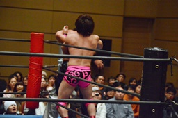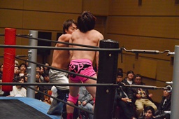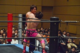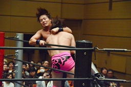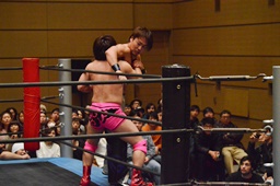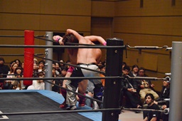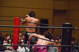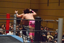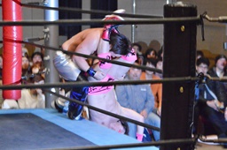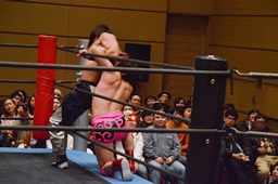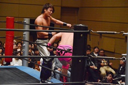 二本目は先にエプロンからの「断崖式」の技を決めて相手を場外に落とした方が勝ち。HARASHIMAが二本連取を狙って石井をエプロンに(右写真)。