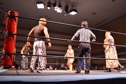 今度は4人ロックアップ、かと思ったら高い位置で星誕期とニラ、低い位置でMIKAMIと伊橋がそれぞれロックアップ(左写真)。