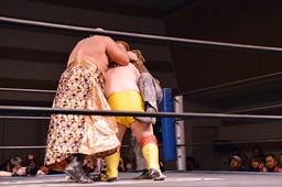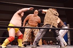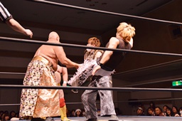 MIKAMIがコーナーに上る、ニラが2人を押さえ込む(左写真)。