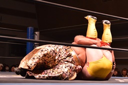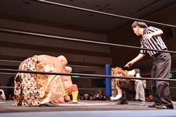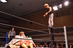 星誕期がMIKAMIを押しのけて伊橋を片エビ固め(左写真)、カウント3。