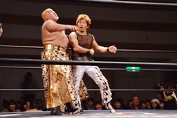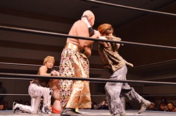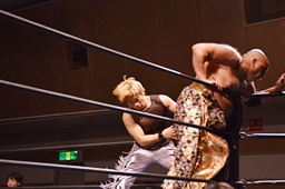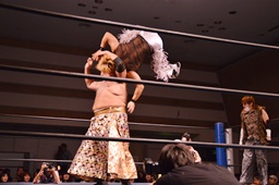 MIKAMI伊橋を首投げ、フェースカットからミッキーブーメラン180(右写真)。