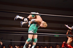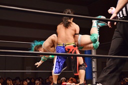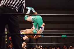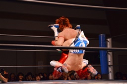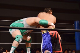 彰人ロープに飛ぶ、入江追走してボディアタック、ジャンピングブレーンバスター(左写真)、カウント2。