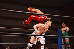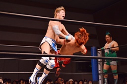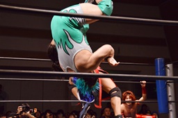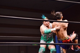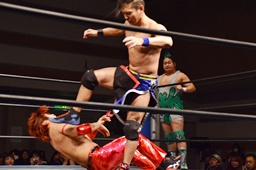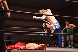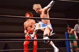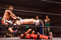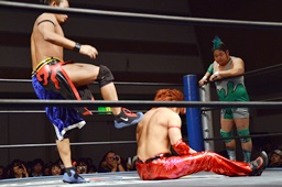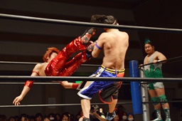 高尾ドロップキック、彰人スカす、ロープワークから高尾その場正面跳びドロップキック(左写真)、入江にタッチ。