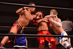 大石ストンピング、ニーリフト、ジャンピングキックで高尾の胸板を蹴り上げる(左写真)。彰人にタッチ。