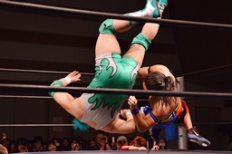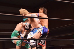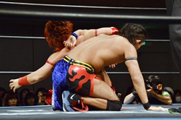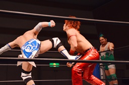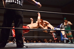 彰人切り返してヘッドロック(左写真)、入江ロープ、高尾にタッチ。彰人も大石にタッチ。