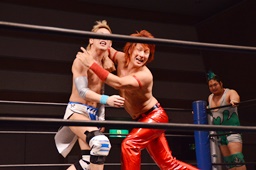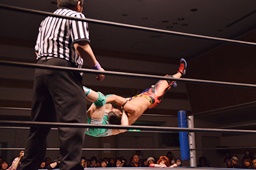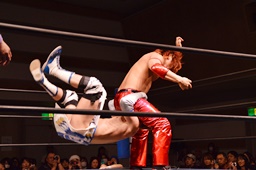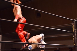 ロープに飛んで前からもう一発(左写真)。ボディスラムからカバー、カウント2。