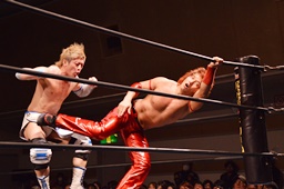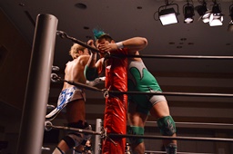 大石フィストドロップ(右写真)。入江が「グーですグーです」とアピール。しかしリングインしてることを注意されると「すいませんでした。」と引き下がる。大石は彰人にタッチ。