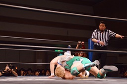 高尾起き上がる、彰人がバック取る、大石がスタナー(右写真)、彰人ベリートゥバック。