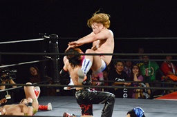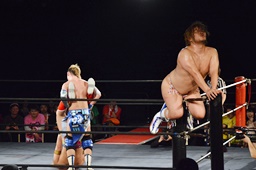 福田コーナーに上ってファイブスター・ダブルアックスハンドル(左写真)、大石はパンチで迎撃。