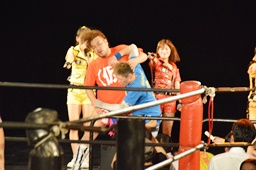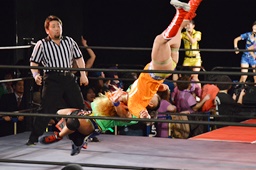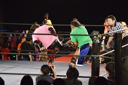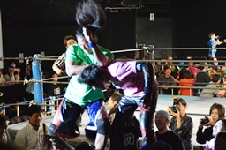 三角飛びケブラーダ!(左写真)彰人が喰らったらしい。
