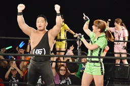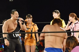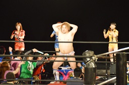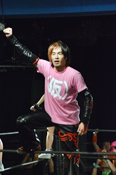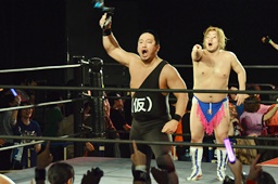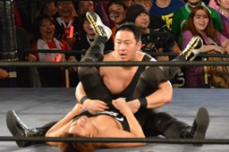 KUDOと飯伏がダブルでロープに振るが大社長はクローズラインかわして2人にクローズライン(左写真)。