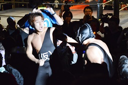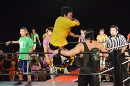 彰人がカウンターに上がってイサミにキック(右写真)、