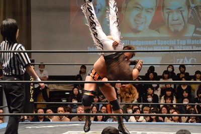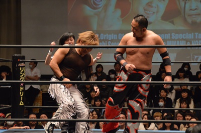 MIKAMIは腹パンで返す(左写真)。佐々木ボディスラム、高井にタッチ。