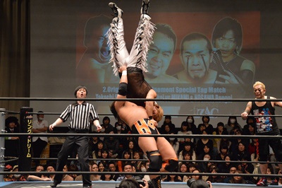 MIKAMIボディスラム狙うが高井ブロックして逆にボディスラム(左写真)、佐々木にタッチ。