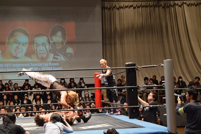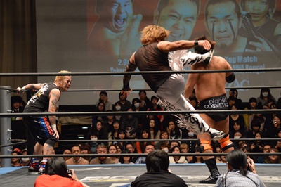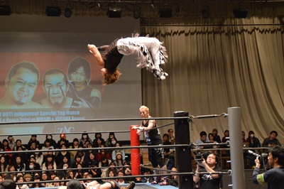 MIKAMIをダブルでコーナーに振ってまず高井が突っ込む、MIKAMIかわして佐々木にドロップキック(右写真)、