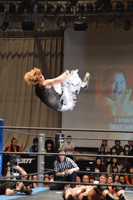 佐々木ボディスラム、高井がコーナーに上ってダイビングセントーン(右写真)、カウント2。