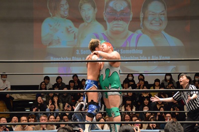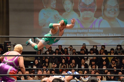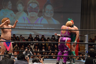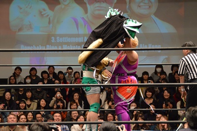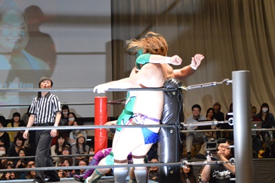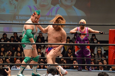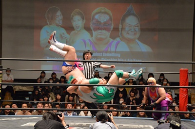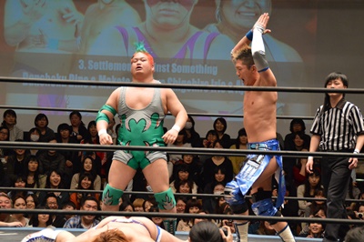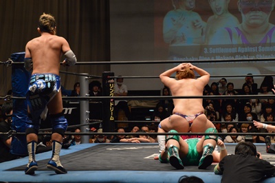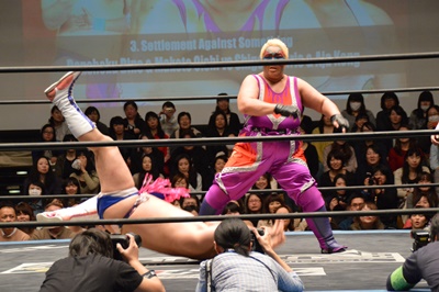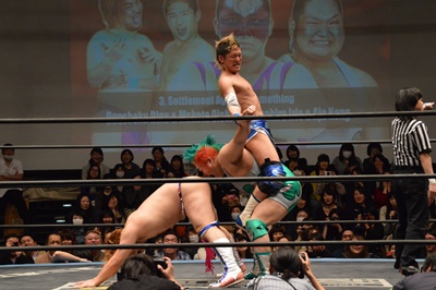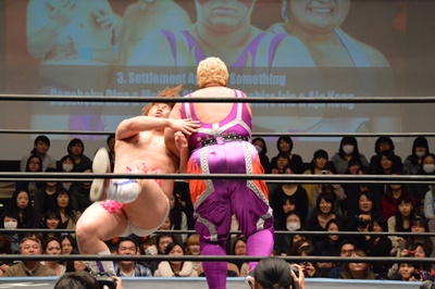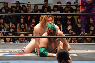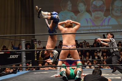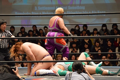 ディーノナイトメア、アジャが張り手、ディーノ入江の顔面に座り込む(右写真)、カウント2。ディーノは大石にタッチ。