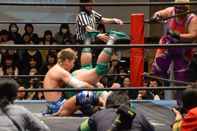 ディーノが「いっぱーつ」と腰を突く、大石がリングサイドからキック(右写真)。
