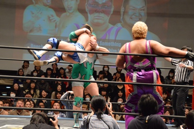 ディーノにはジャンピングブレーンバスター(右写真)、アジャにタッチ。