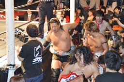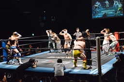 GO-1 CLIMAX 2014トーナメントに出なかった10人による「箸休め」10人タッグマッチ。大鷲軍はみんなで大鷲式リングイン(右写真)。