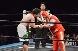 3/21後楽園大会で「好きな選手と戦える権利」をGETしたワンチューロ、迷わず憧れの菊タローを指名。すぐにブッキングされて今日の対戦に。まずは握手(右写真)。