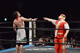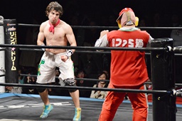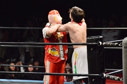 ワンチューロ菊タローをコーナーに振って突っ込む、2回やって2回とも菊タローのカウンターキックを浴びる(左写真)。