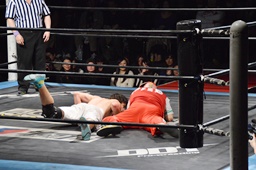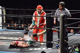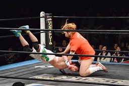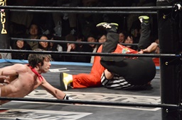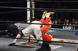 菊タロー首固め(右写真)、カウント2。
