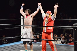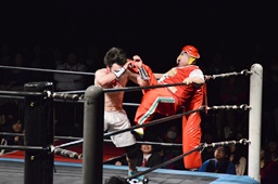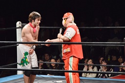 菊タロー「あと2ヶ月でチリに帰るのに、DDTは新日本とも全日本ともつながりあるから誰でも呼べるのにこんな夜中に俺呼びつけて!俺を呼んでくれて、ありがとう。一度試合したからアミーゴだ。ワンチューロ、会ってから結構経ったけど、初めて試合できたな。チリに帰っても、日本で得たテクニックでチリのトップに立って、TVつけてビッグカンパニーにして、俺をビジネスクラスで呼んでくれ。」(右写真)