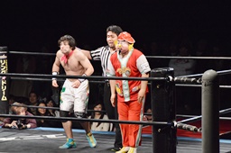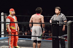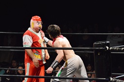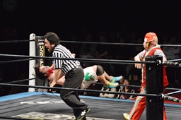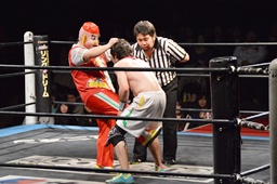バックの取り合いから菊タロー急所蹴り(右写真)、ワンチューロが菊タローに急所蹴り、菊タロー松井レフェリーに急所蹴り。
