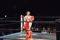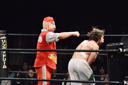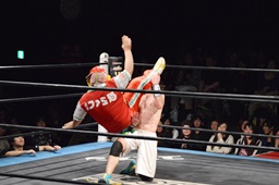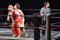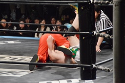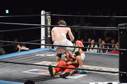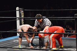 ロックアップ、菊タローヘッドロック、ワンチューロロープに振る、菊タローショルダーブロック(左写真)。
