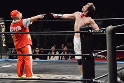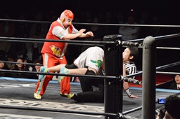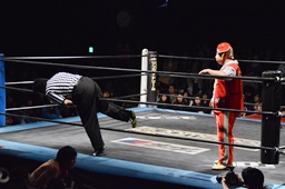 松井レフェリーがワンチューロの様子を見ようとロープをまたぐと菊タローはロープを蹴る(右写真)、松井レフェリー急所にダメージ、場外転落。
