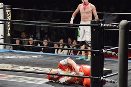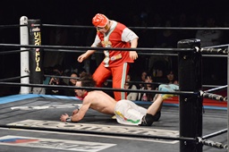ヒザを着いて立ち上がろうとしたワンチューロにシャイニング菊ザード(左写真)、カウント3。