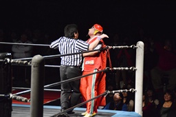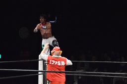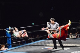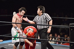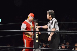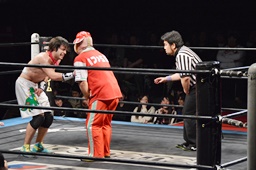 コーナーへの振り合いから松井レフェリーがワンチューロにラリアット(右写真)。