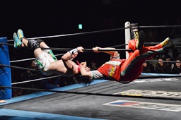 ワンチューロは首投げ、ロープの間を2往復してヒザ蹴り(左写真)。