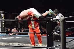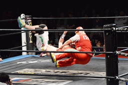 菊タローこの体勢からのヘッドバット(左写真)、ワンチューロを場外に落とす。