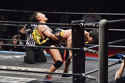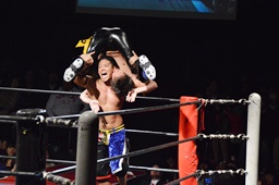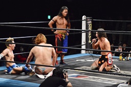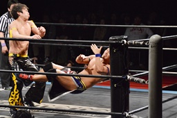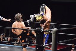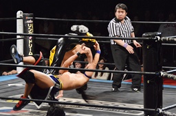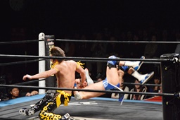 KUDOボディスラム、コーナーに上る、彰人も起き上がる(右写真)。彰人コーナーに上るがKUDO落とす。