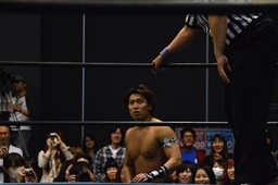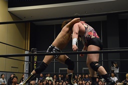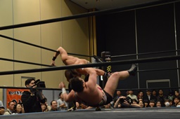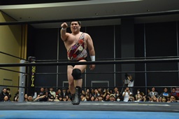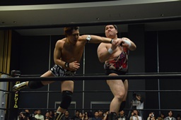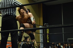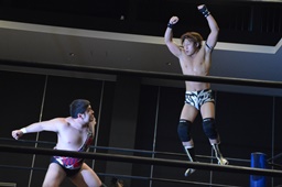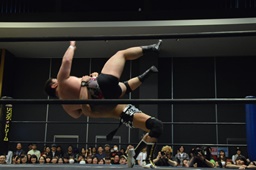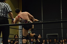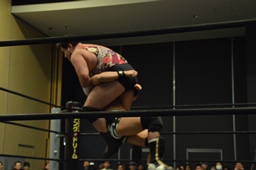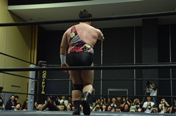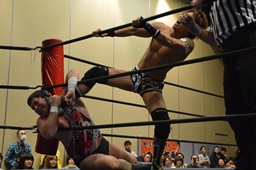 平田アントンをボディスラムで投げてコーナーに上る(右写真)、