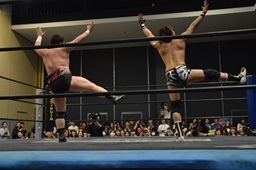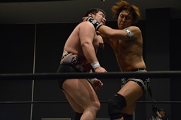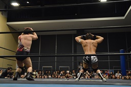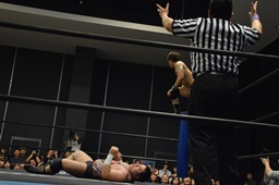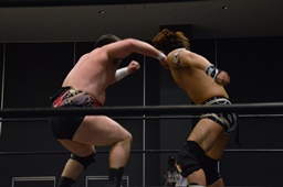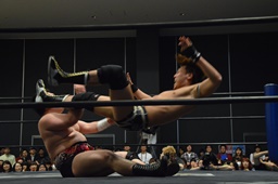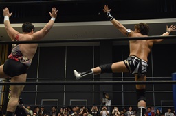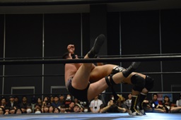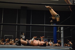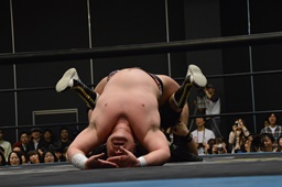 平田対角線コーナーに振る、アントン切り返して突っ込む、平田カウンターキック、ロープに飛ぶ、アントンはテーズプレス(右写真)からフォアアームドロップ、カウント2。