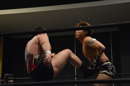 ロープに飛んでスライディングキック(右写真)、カウント2。