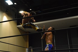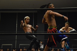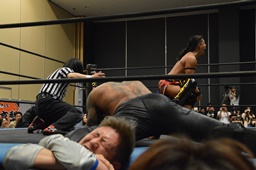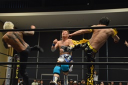 大石ロープに飛ぶ、KUDO追走してキチンシンク(左写真)、坂口にタッチ。