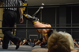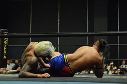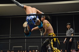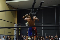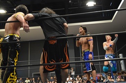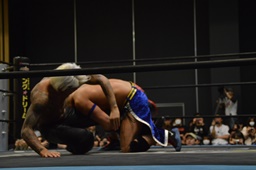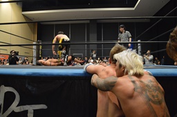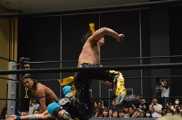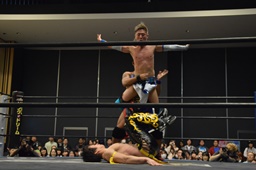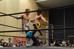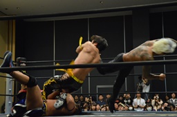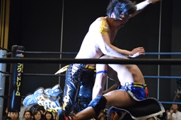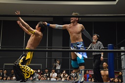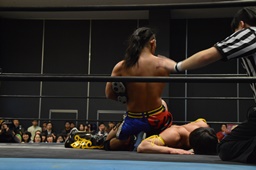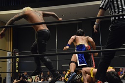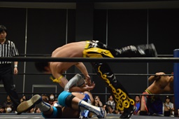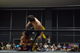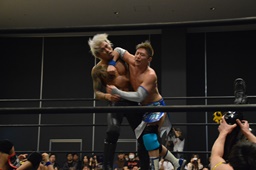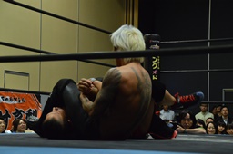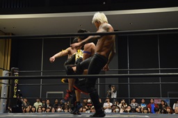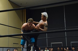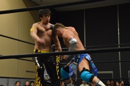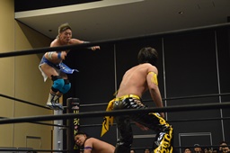 彰人坂口をコーナーに振って串刺しスピアーからダブルアームスープレックス(左写真)、カウント2。