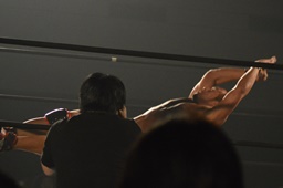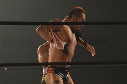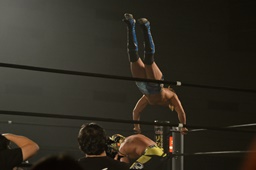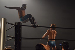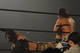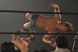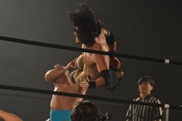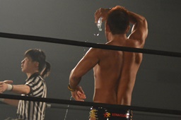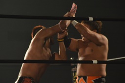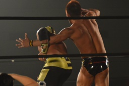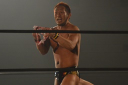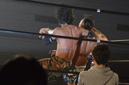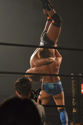 彰人ボディスラムからカバー連発、内田2で返す。彰人ロープに振る、内田ブロックして河津落とし(右写真)。